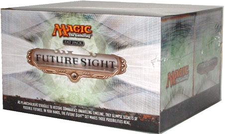 • Player's guide with complete visual encyclopedia • 2 card boxes with panoramic art and 6 plastic dividers • 6 Future Sight booster packs • 40 card Time Spiral basic land pack • Future Sight Spindown life counter, available only in the fat pack • 1 random Pro Tour Player card • Future Sight novel
